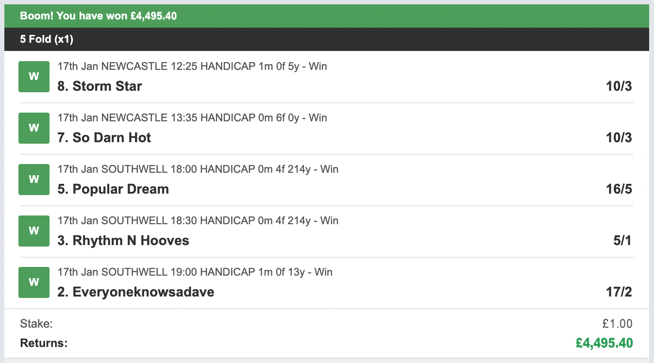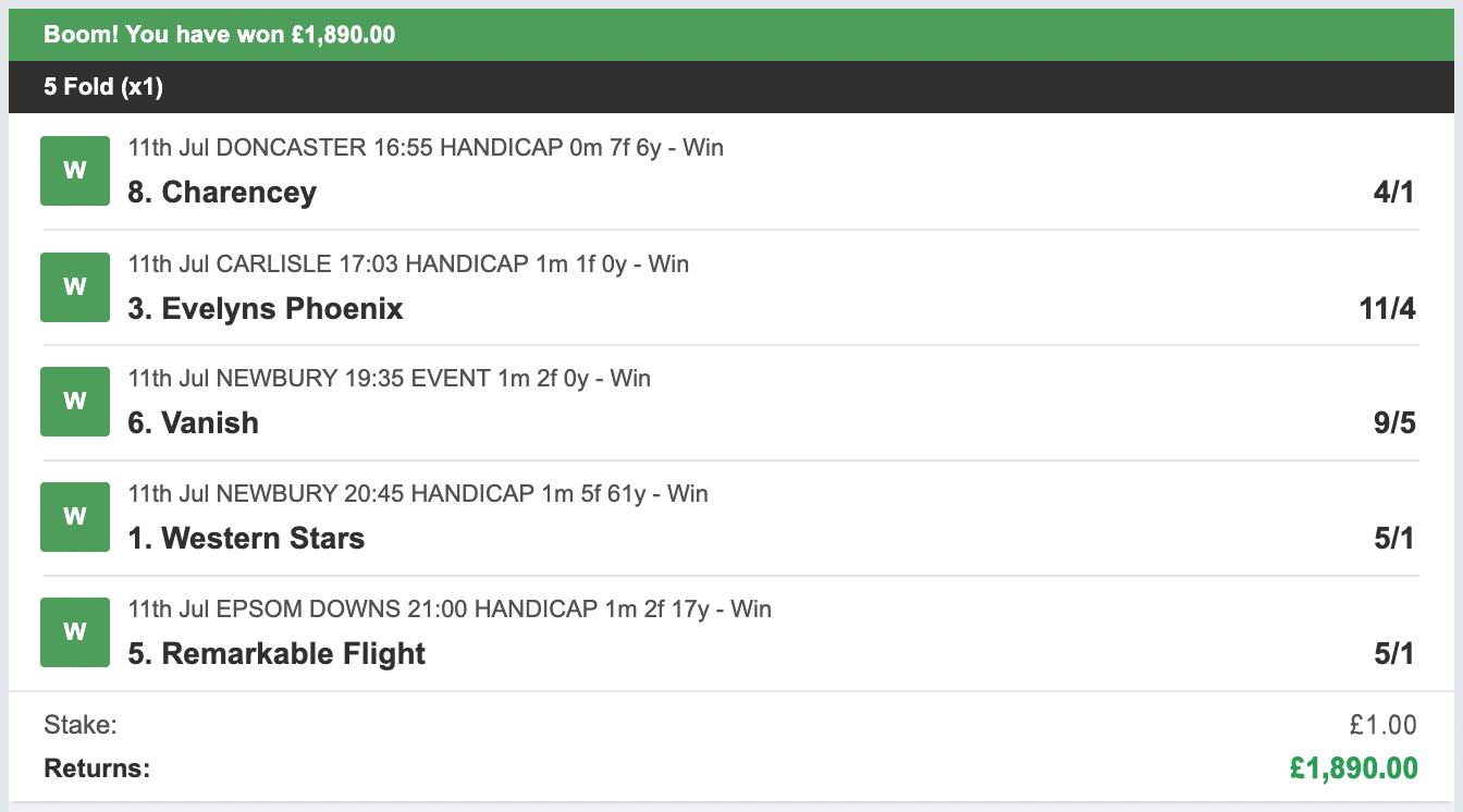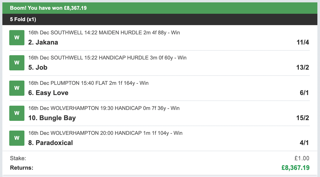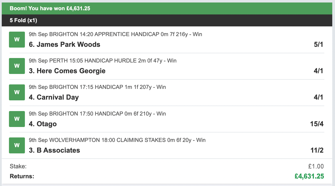 Dear Friend, OK before we go any further I want to make something perfectly clear. I'm not hear to waste your time and in return I don't expect you to waste mine. - If you're looking for a "Get Rich Quick" scheme... close this page now! This is NOT for you! - If you expect winners every single day and can't fund losing runs... close this page now! This is NOT for you! - If you don't understand that profitable betting is a long term strategy... close this page now! This is NOT for you! OK now that we've got rid of a few time wasters here's the deal... What I have for a select few of you today is the chance to use the same selections I use to make some BIG paydays betting on the horses. WHAT IS ONE POUND PUNT?My tried and tested strategy generates BIG returns with LOW RISK daily investments. All bets are placed in a way so we can maximise just a single bet each day. The key points to this strategy are... [-] Use ONLY a single £1 bet per day! I know a lot of punters that have a tipster they follow, who they like to follow and will always follow. No problem from me, if you are one of these people consider yourself very lucky, a lot of punters will never find a tipster that they are that comfortable with! I wanted to create a strategy that would appeal to everyone, even the punters who already had enough tips per day from their reliable sources. To enable this to appeal to everyone the bank required to start needs to be low and the risk low. That's why I went with just a single £1 stake per day! You can even bet less if you want and still make a good profit! The next step was to not make it long winded and complicated. No placing multiple bets per day. Instead, we cap the bet to just 1 per day. So that's what I did! Each day our bet is made up of just 5 horses. In order to make any money ALL 5 horses must finish 1st! This bet is called a Fivefold and can be placed at any bookie (online or on the high street). When all 5 selections come in... we make a HUGE PROFITS! If not we lose ONLY £1 for the day! MY RECENT PROFITS!Since 1st July lasy year I have only had 4 profitable days... However... these 4 profitable bets have made us a MASSIVE £19,228.84 PROFIT in JUST 7 months! I have quite a few losing days with my system, after all winning all 5 horses in a single day isn't easy... If it was everyone would be doing it! BUT when a winner comes in you'll forget about those... after you pick yourself up off the floor! Any one of my winners would have put you in serious profit for the entire year! If you like HUGE PROFITS... you'll LOVE my tips! Here's my winners since 1st July 2024 (JUST 7 Months), so you get an idea of what kind of returns you can expect... MY WINNERS...